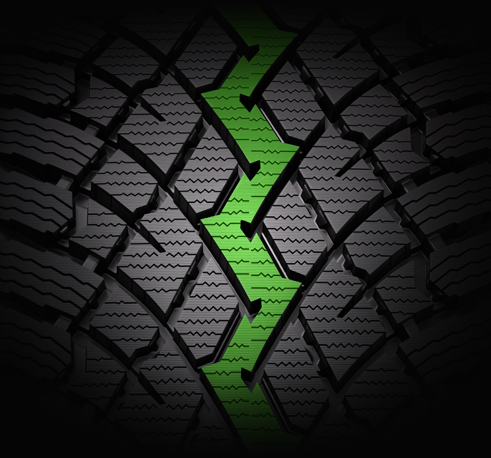 Вытянутый V-образный дизайн помогает мгновенно удалять влагу и снежную кашу из зоны контакта, исключая вероятность формирования наледи на блоках и минимизируя риск слешпленнинга. Благодаря этому авто имеет уверенное сцепление и короткий тормозной путь. Дренажные канальцы, расположенные поперек основного рисунка, работают как пути для отвода влаги, повышая предсказуемость при движении по мокрому снегу и минимизируя вероятность проскальзывания колес при старте.